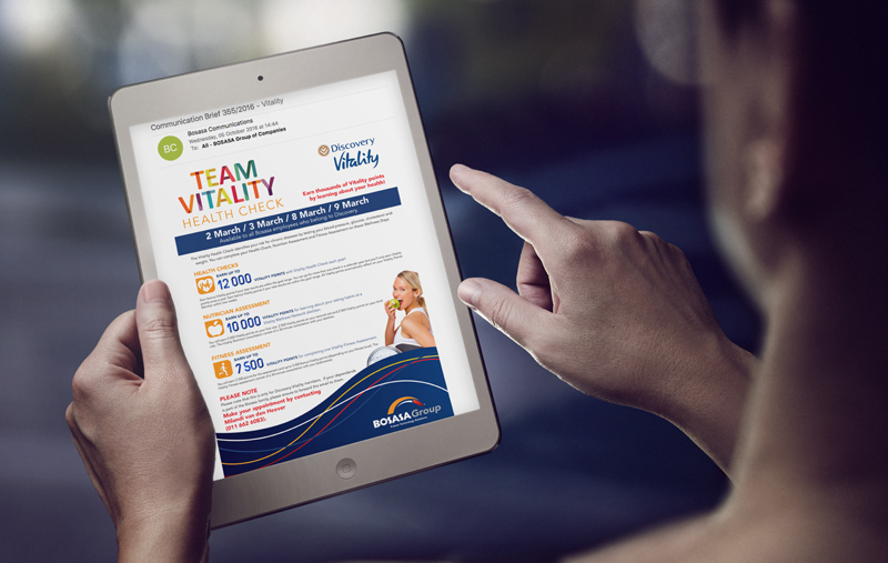 I designed a mailer to entice the readers and get them interested in some of the benefits offered by Discovery to the BOSASA Group employees. I also did a Christmas mailer that went out to employees and clients.
